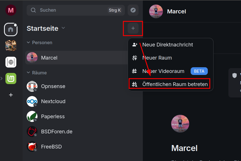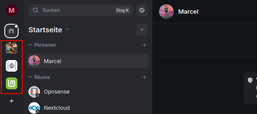 Mit einer eigenen Matrix Adresse (Egal ob die nun von einem eigenen oder öffentlichem Server stammt), kann noch ein bisschen mehr gemacht werden, als reine Text Nachrichten hin und her zu schieben (natürlich kann ich unter @marcel:stritzelberger.de jederzeit angeschrieben werden). In Matrix dazu sind Räume und Spaces zentrale Konzepte, die die Organisation von Kommunikation strukturieren: