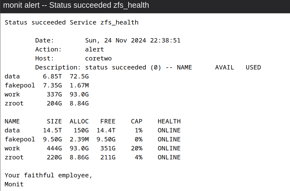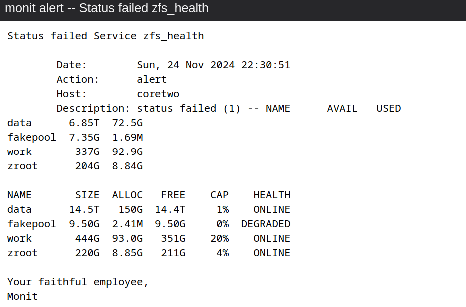 Bei einem Fehler sendet Monit dann brav eine E-Mail mit den Details zum Fehler und betroffenem ZFS Pool.