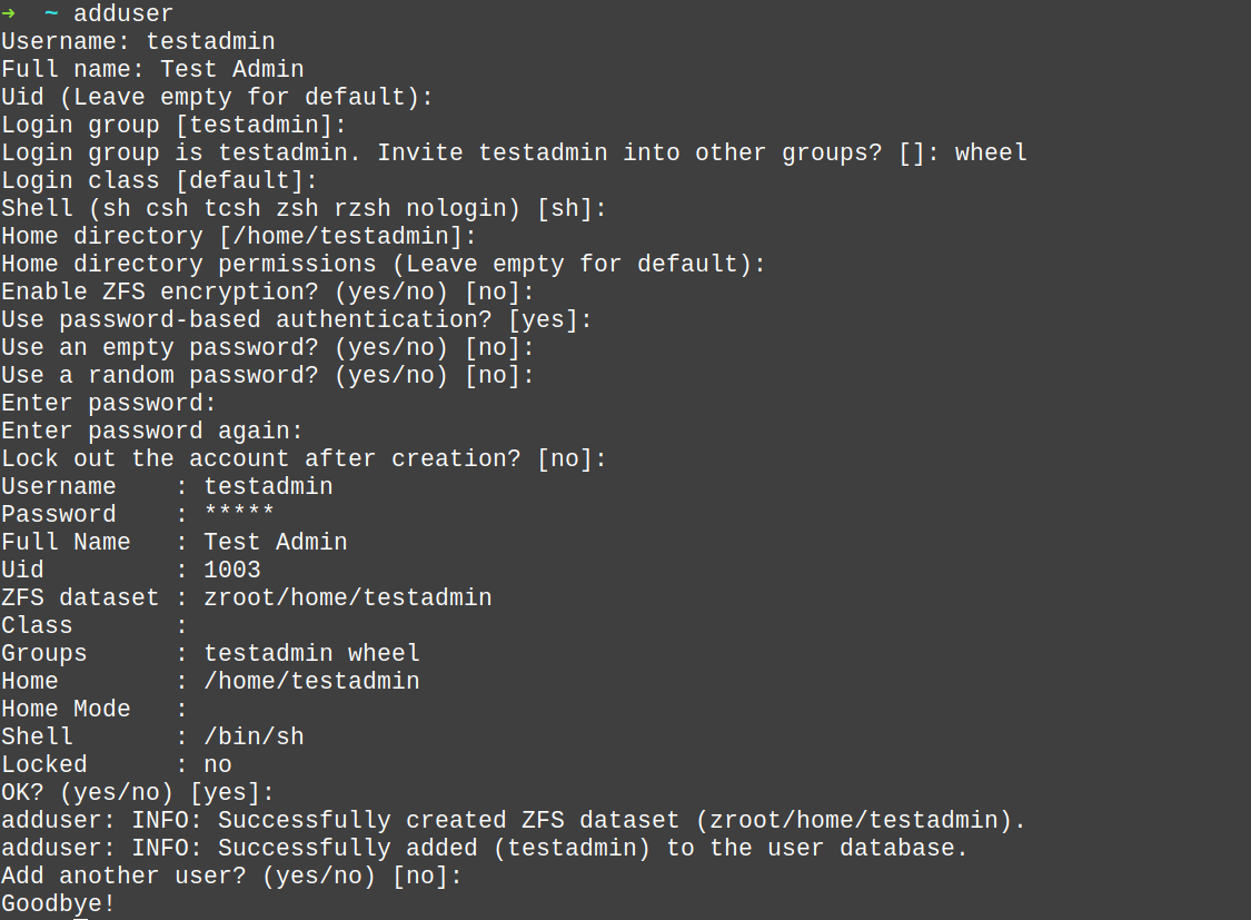 Der Befehl adduser ist soweit selbsterklärend. Da wir hier einen administrativen Benutzer erstellen wollen ist es wichtig, das der Benutzer der Gruppe wheel angehört. Der Rest ist Geschmacksache.