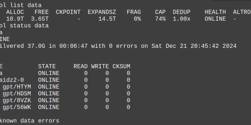 Nur kurz notiert. Als ich meine defekte Festplatte austauschte, wurden auch gleich alle gegen größere Modelle ausgetauscht. Ich liebe Upgrades. Bei der Datenmigration ist mir erst später aufgefallen, dass die tatsächliche Größe des Pools nicht mitgewachsen ist. Das lässt sich mit einem kleinen Schritt beheben.