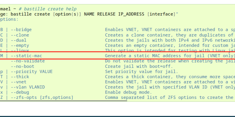 Mit der neuen Bastille Version kann nun ENDLICH einem FreeBSD Jail eine feste MAC Adresse zugeordnet werden. Das ist dann hilfreich, wenn die Zuteilung der IP Adressen mittels DHCP erfolgt (so wie bei mir). Los gehts.