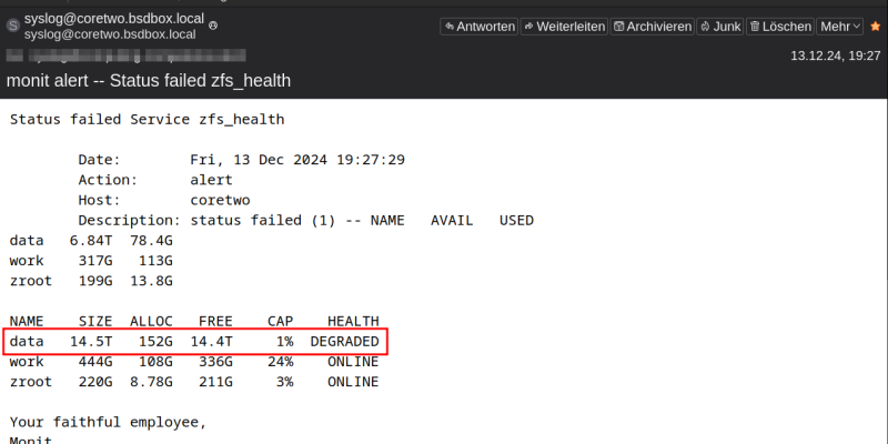 Bei der Erstellung der Artikelserie FreeBSD als Server ist mir tatsächlich eine Festplatte ausgefallen. In so einem Fall zögere ich nicht lange und tausche sie sofort aus. Meine Daten sind mir wichtiger als ein eventuelles "wird schon gut gehen", auch wenn die Platte nach einem Neustart wieder da war. Mit ZFS hat das seinen Schrecken verloren.