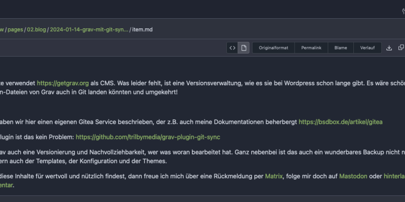 Diese Website verwendet https://getgrav.org als CMS. Was leider fehlt, ist eine Versionsverwaltung, wie es sie bei Wordpress schon lange gibt. Es wäre schön, wenn die Markdown-Dateien von Grav auch in Git landen könnten und umgekehrt!